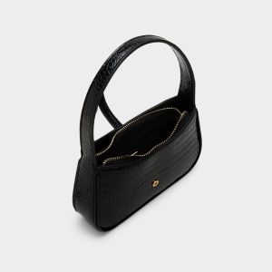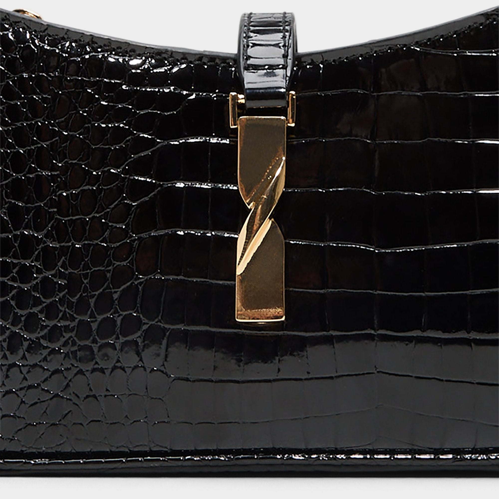 Glossy croc-embossed leather meets a sculptural gold push-lock. giving this sleek shoulder bag a confident silhouette. a sense of luxe polish. and a signature hardware moment. Tuck it against a silk slip for rooftop drinks. or carry it with a tailored blazer and denim for weekday dinners.