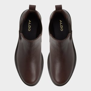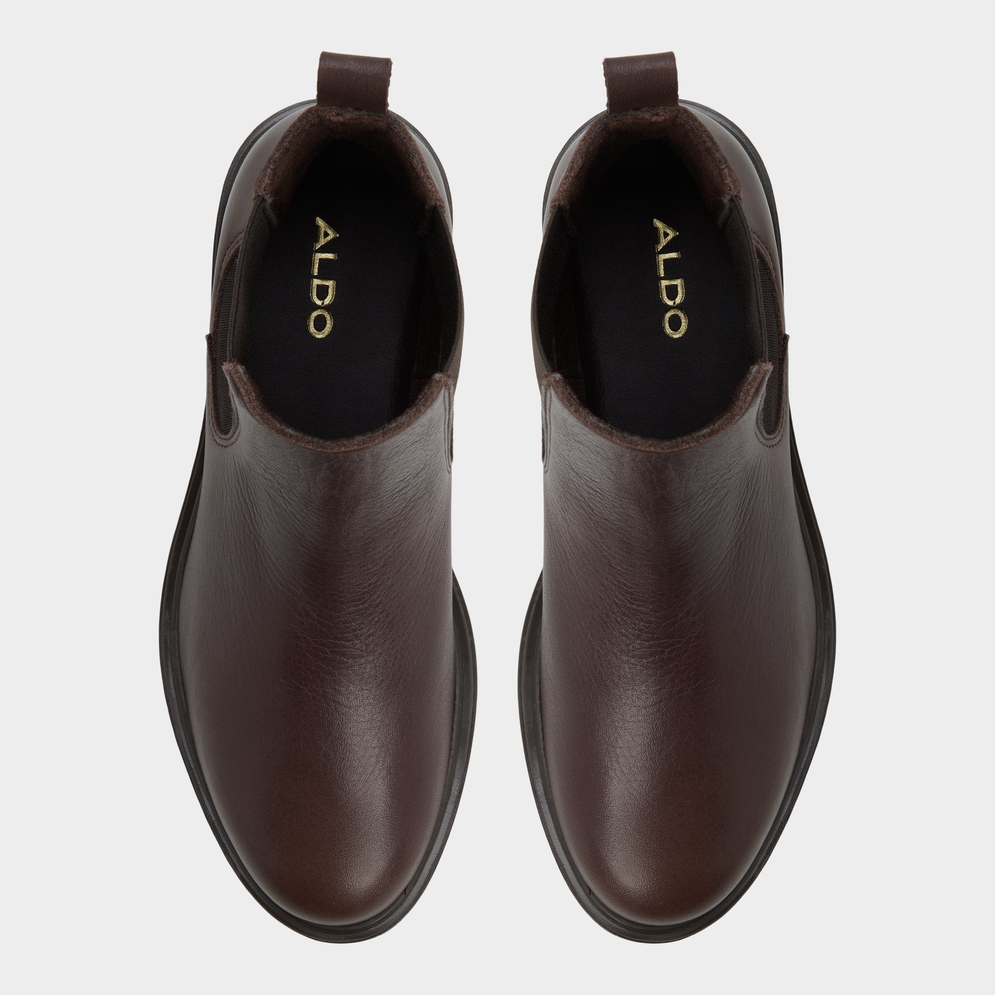 Rich chocolate leather grounds this streamlined Chelsea boot. with treaded lug soles delivering city-ready grip and a subtle lift. while elastic side panels make slipping in effortless before the morning coffee. Pair with cropped trousers for presentation days. or swap in a sweater dress when leaf-crunch walks segue into fireside cocktails.