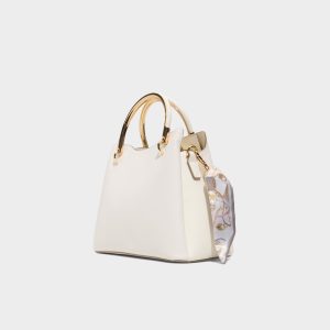 Gold-tone hoop handles rise from softly pebbled white leather. while a chunky chain with a removable silk-print scarf becomes a shoulder strap. giving this top-handle bag day-to-night flexibility. Carry it with a tailored blazer for coffee briefings or sling it over a slip dress at evening weddings to polish the look.