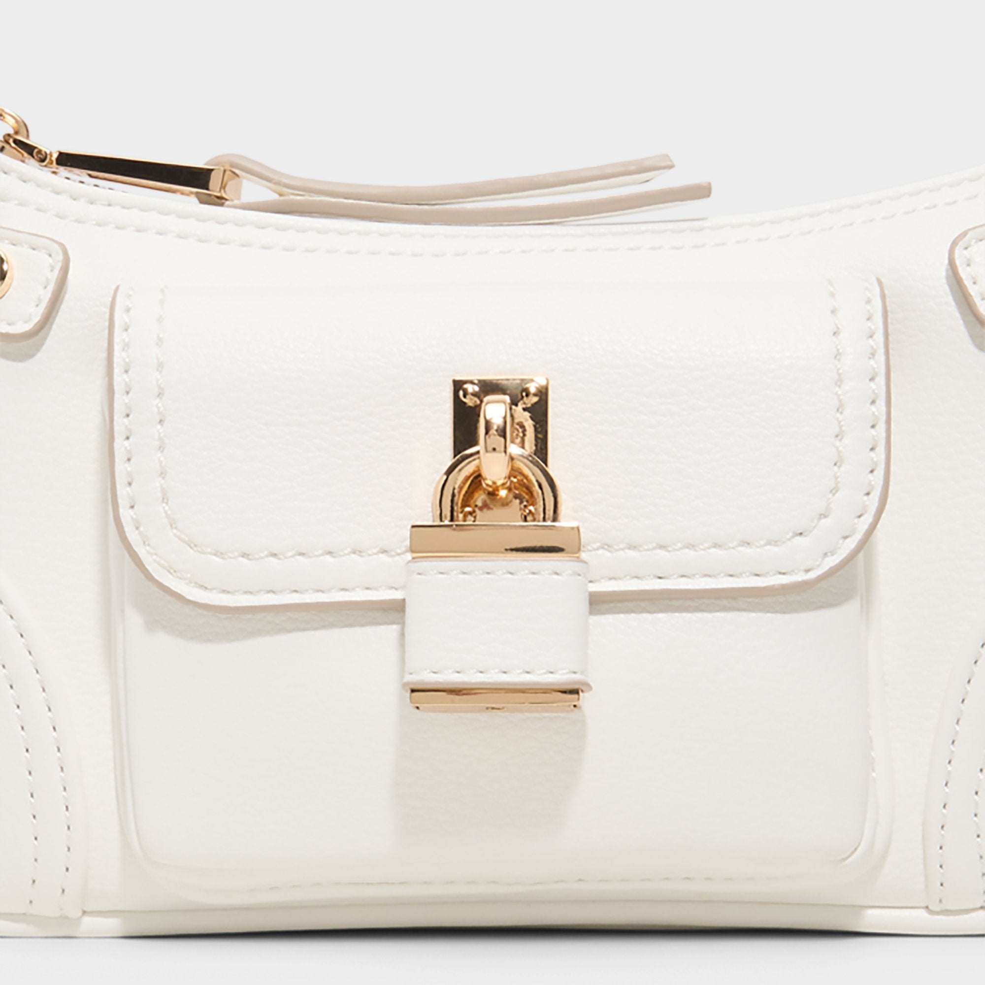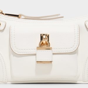 Smooth white leather meets a baguette-inspired silhouette. a sleek compact bag that radiates modern polish. with a gleaming padlock clasp as a bold hero detail that adds movement and a touch of playful edge. Carry it with a sleek dress for rooftop cocktails or sling it over denim for casual city strolls.