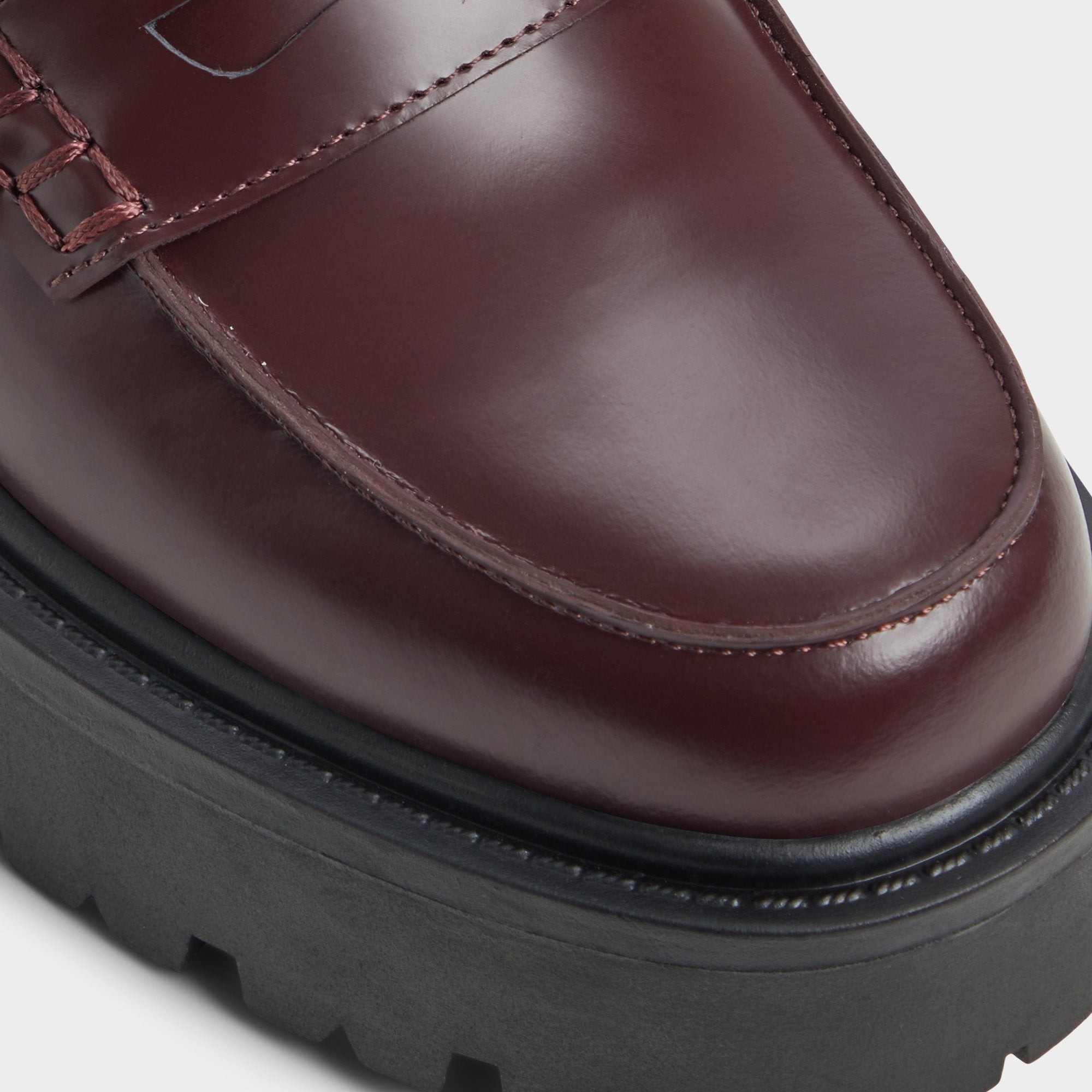 Glossy burgundy leather shapes this refined penny loafer. with a chunky lug platform sole adding stealth height and street-smart grip. transforming it into a power move for long lectures and commutes. Pair with pleated minis for campus coffee runs or ground an oversized blazer set when pitch meetings demand cool confidence.