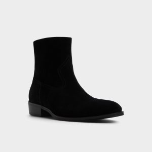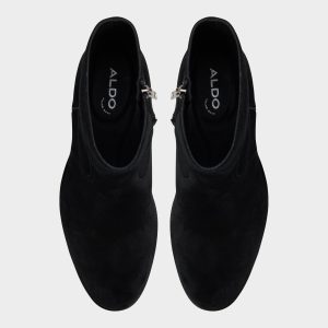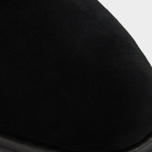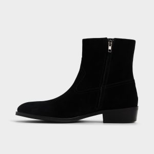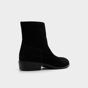 Velvety black suede shapes this sleek ankle boot. featuring a hidden side zip for quick exit and a low block heel that maintains a sharp silhouette from office days to night outings. Pair with slim charcoal denim for gallery trips or tuck under a tailored suit-the suede effortlessly balances the formal look.