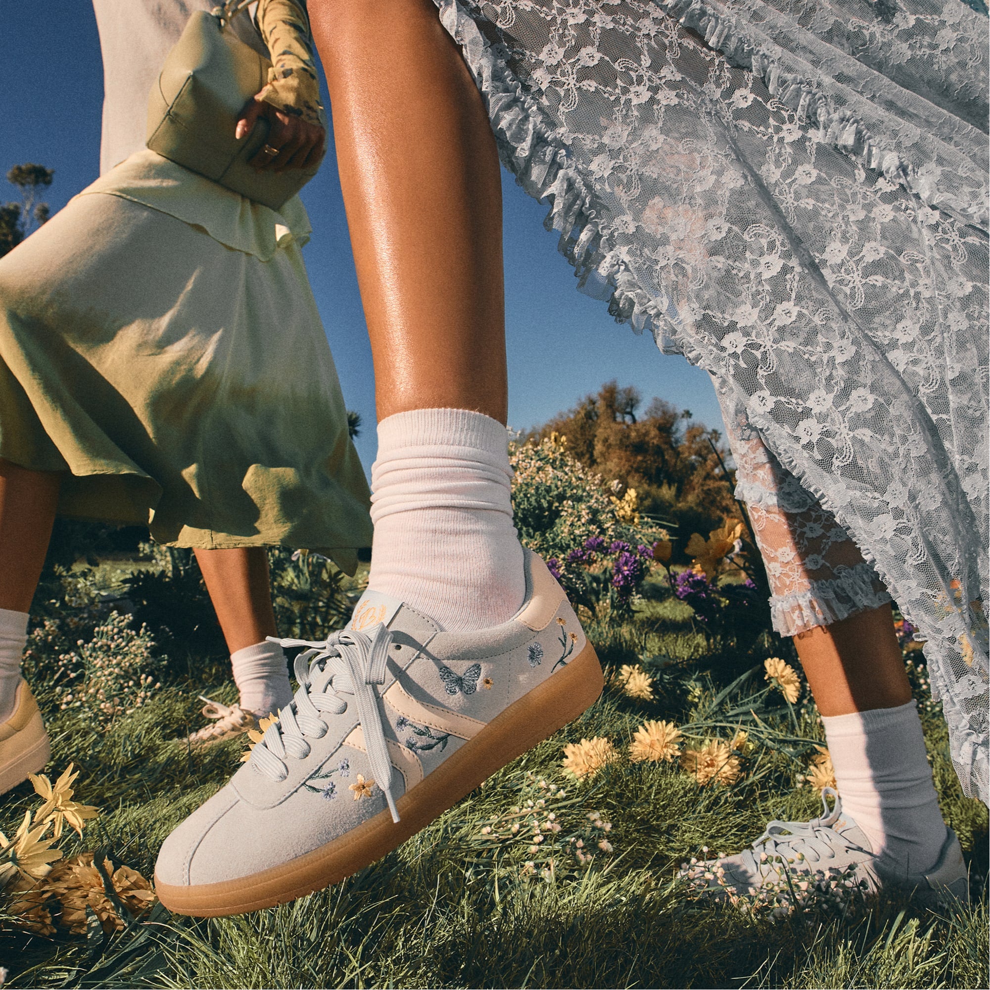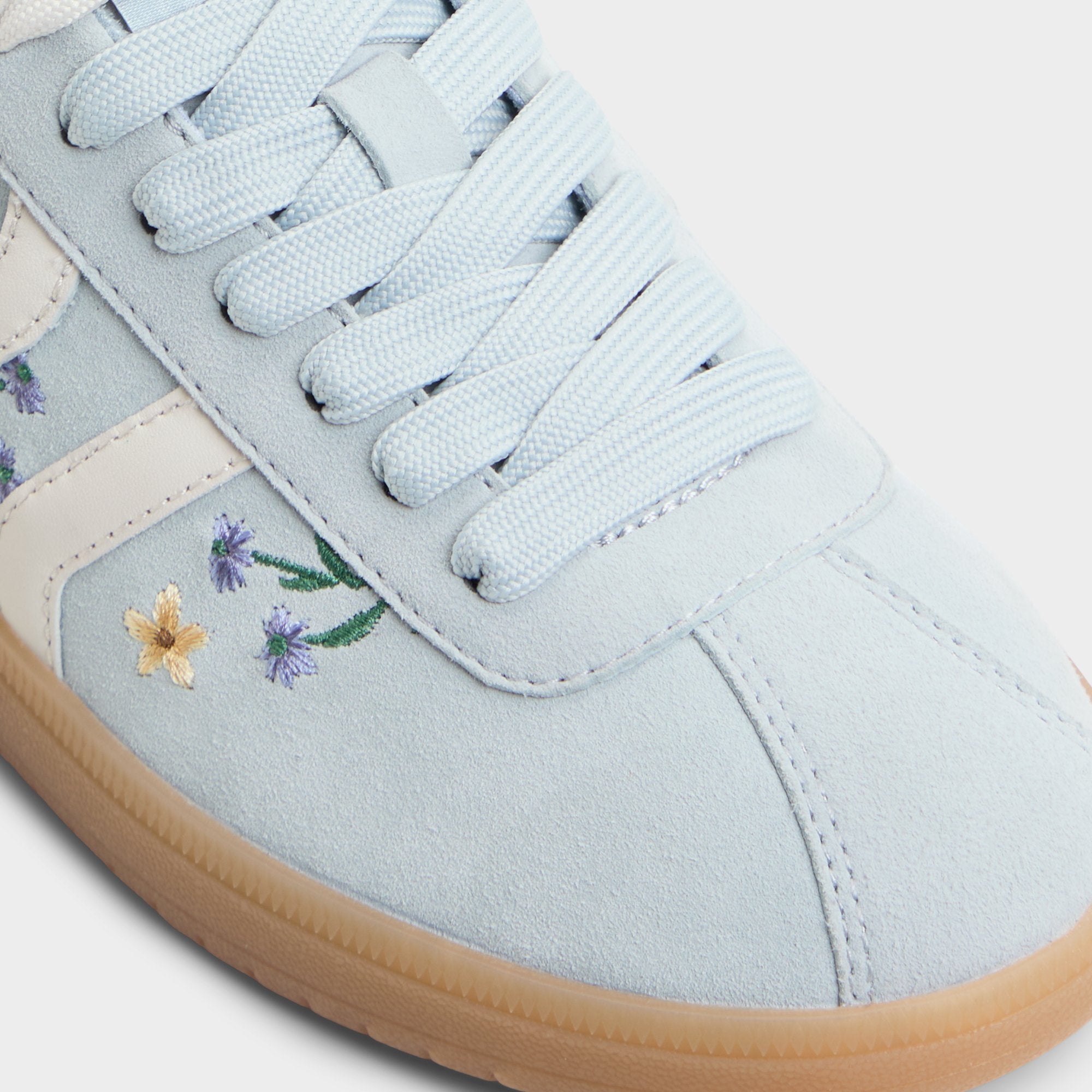 Pastel suede sets a calm stage as floral embroidery blooms along the sides. while retro gum cup soles cushion cafe hops and campus dashes from sunrise to city lights all day long. Pair with cropped white denim for weekend markets. or drape a breezy midi for spontaneous dinners under blue skies.