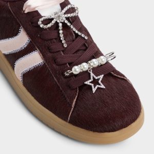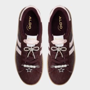 Deep merlot pony hair wraps this retro cup-sole sneaker. pairing soft blush stripes with rope-style laces for quiet varsity vibes. while cloud-soft cushioning keeps every city detour scenic and ready for spontaneous adventures. Pair with cuffed denim for weekend coffees. or ground a satin slip beneath stage lights as the night comes alive.