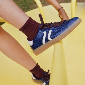 Glossy croc-embossed patent leather transforms this retro cup-sole sneaker into midnight swagger territory while creamy side stripes and gum rubber maintain grounded style and cushioned comfort through every adventure. Pair with tailored joggers for airport dashes or slide under a satin slip skirt when gallery hops demand easy confidence.