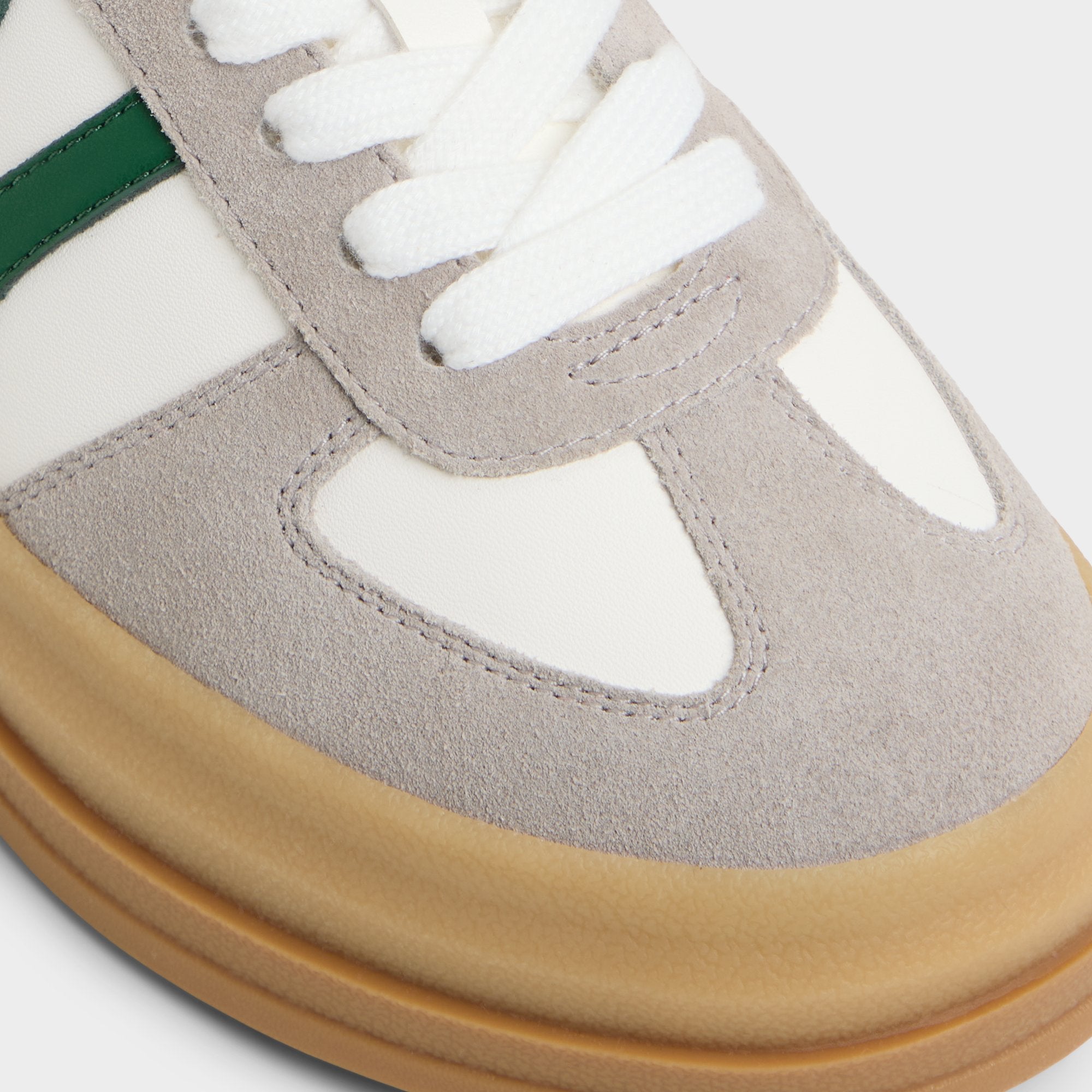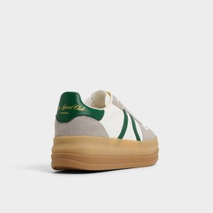 Stadium-ready green stripe races across smooth leather and suede. riding a chunky gum platform that adds confident height and a bold. crowd-pleasing silhouette you can wear beyond game day. from sidewalks to after-hours. Pair with cropped denim for a sporty brunch. or ground with satin skirts for city-hops and rooftop celebrations.