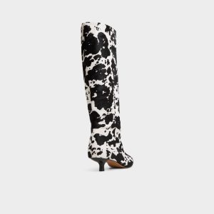 Cow-print faux fur wraps the knee-high shaft while kitten heel and pointy toe keep it bold yet easy. Pair with micro skirt for rooftop album drops or swap into dark-slim denim when gallery hops stretch past midnight.