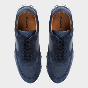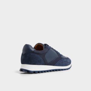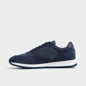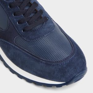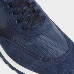 Midnight-blue suede pairs with smooth leather panels on this jogger. catching light across contrast textures as a cushioned rubber sole keeps daily miles easy and the silhouette ready for coffee runs or longer city strolls. Team it with cuffed chinos for patio brunches. or roll with jogger pants on red-eye flights.