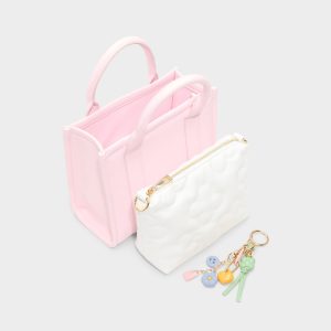 Pillow-soft marshmallow-pink panels frame this petite tote. with clean vertical seams and a flower-and-heart charm that adds playful mood as you go about your day. from morning coffee to sunset strolls. Carry it with linen pants for cafe mornings. or sling it with a sundress and sandals for outdoor dining.