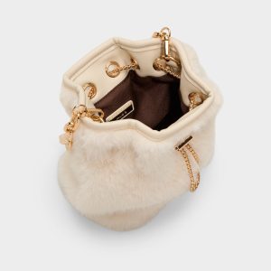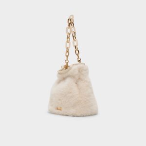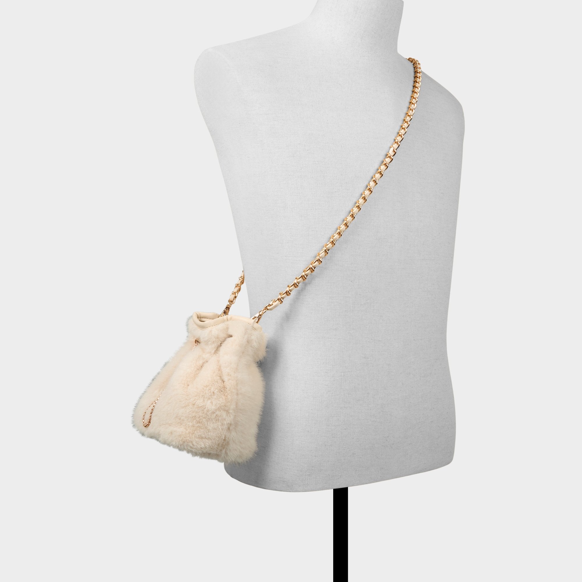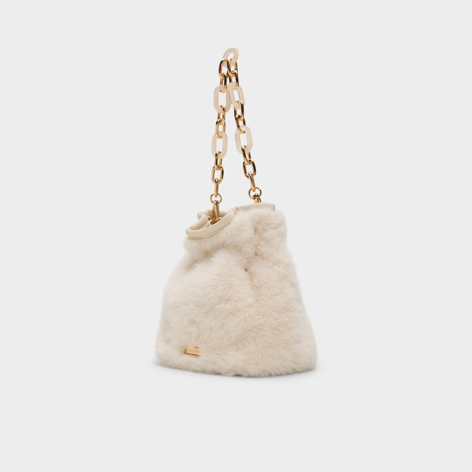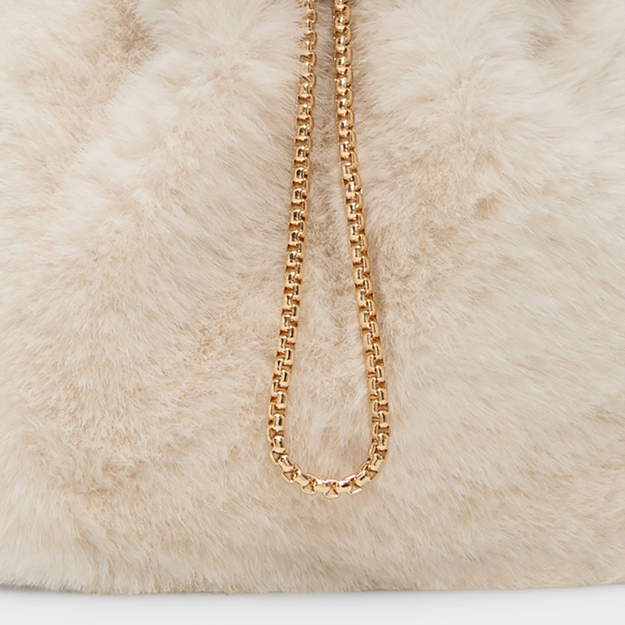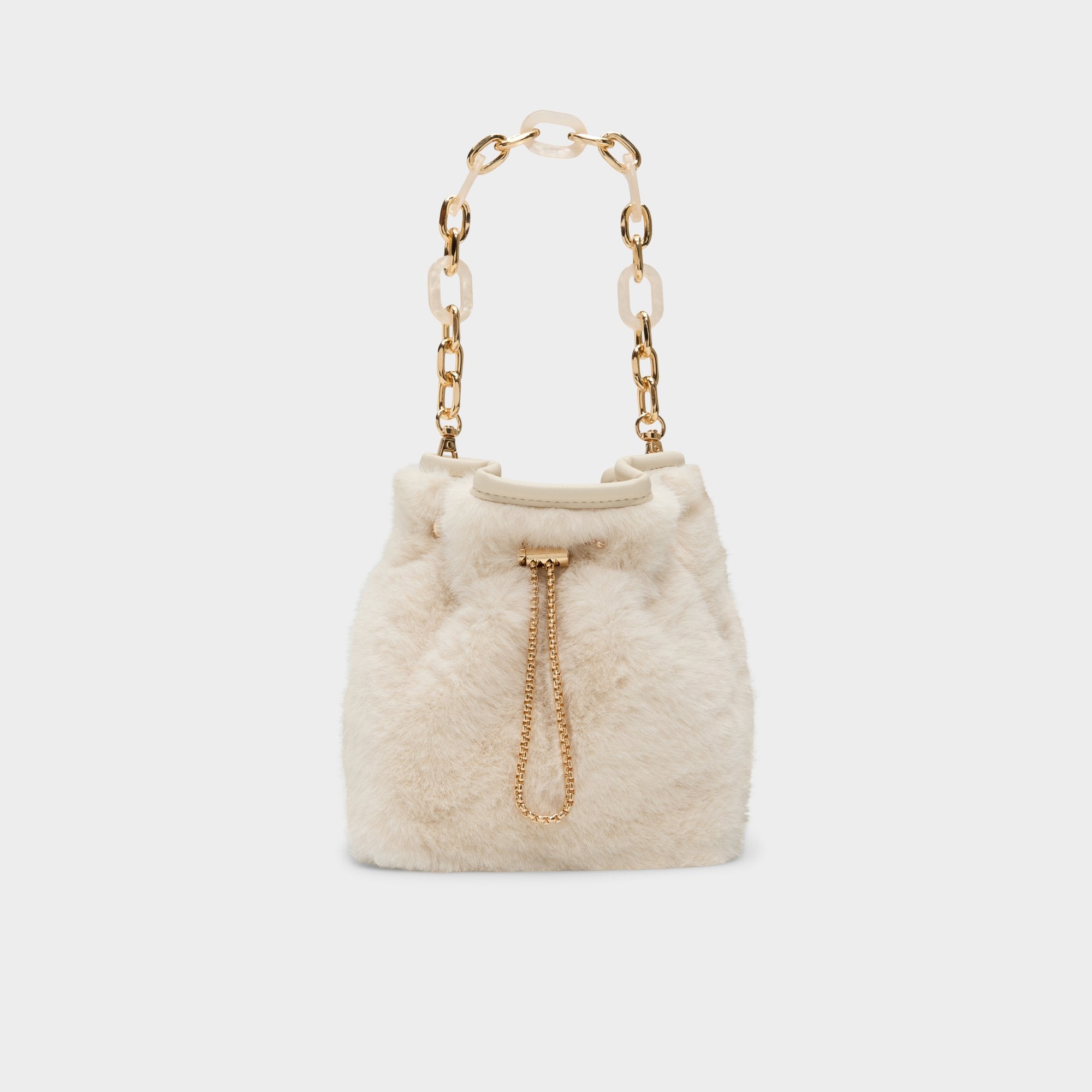 Plush faux fur swathes this bucket bag in apres-ski luxe. while an oversized gold-link handle steals the scene like wearable jewelry. the bold design cue that instantly elevates a look from casual to chic. Pair it with ribbed knits for casual meetups or drape it over a satin mini for festive gatherings. finishing the look with effortless city-polish.