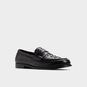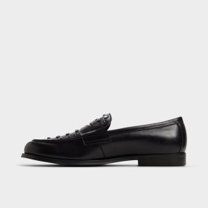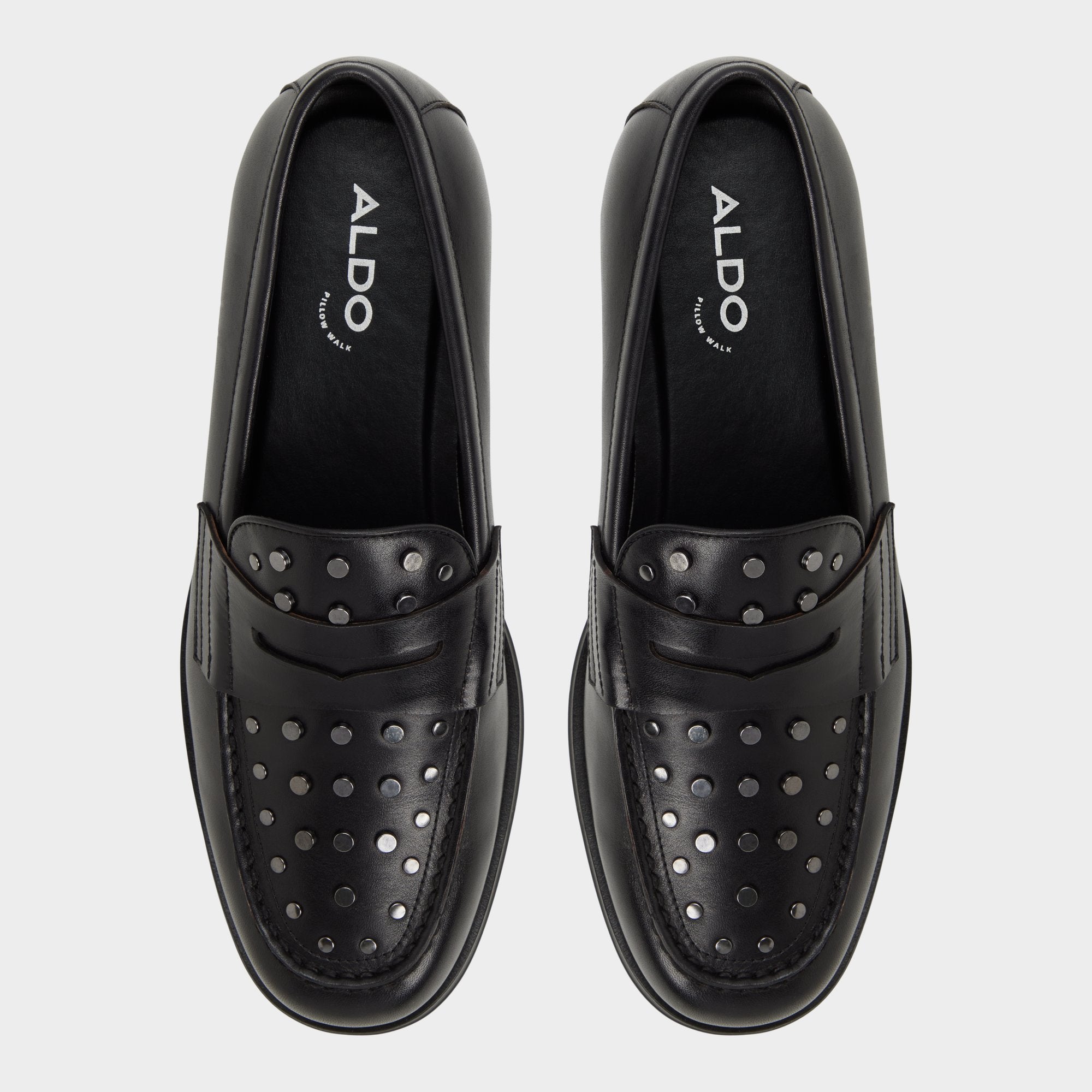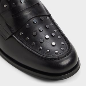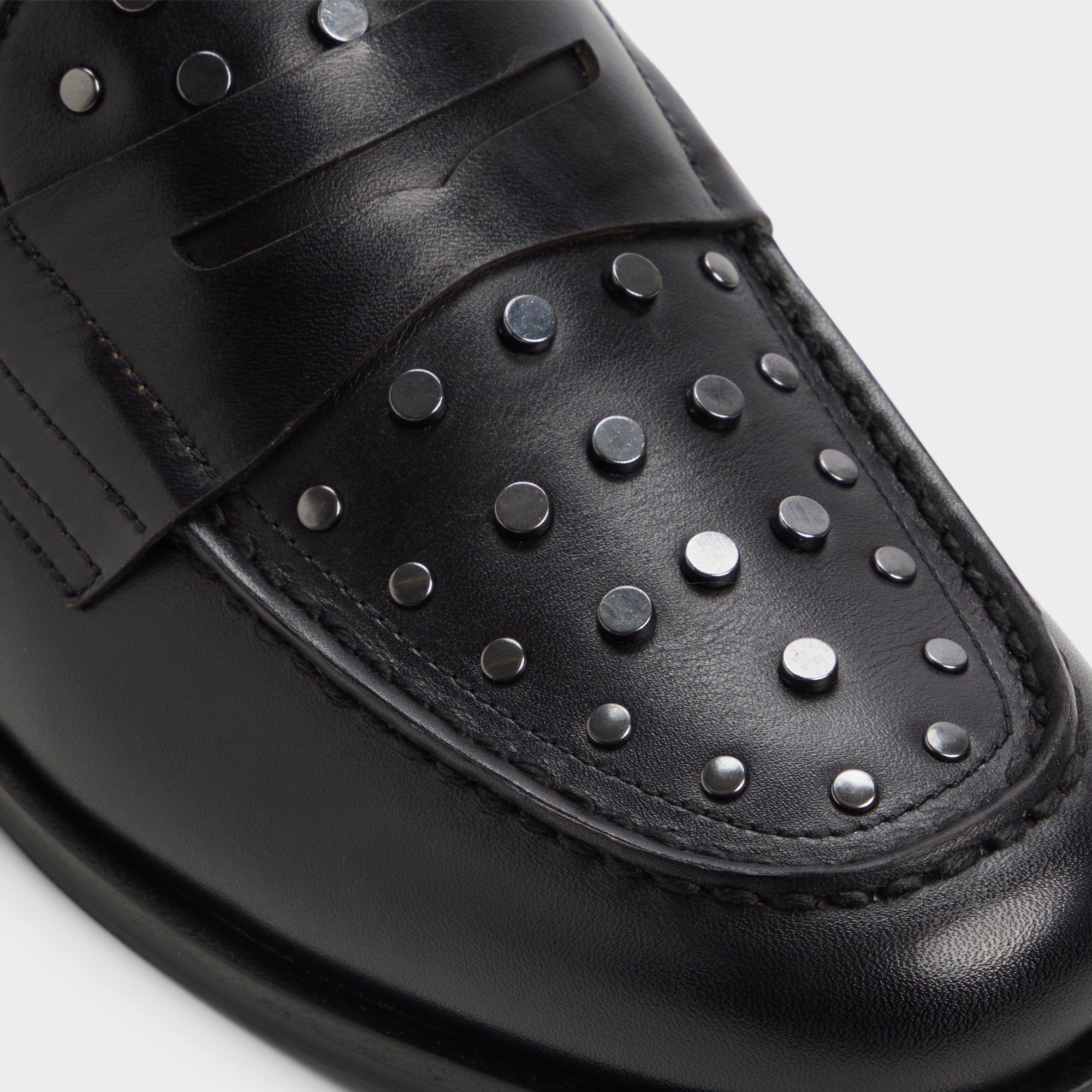 Gunmetal studs arc across the penny strap and toe. giving an edge to this black leather loafer you can wear from the office to after-hours. Pair with slim charcoal suits for office success or wear with cuffed jeans at gallery nights—the studs’ gleam makes a statement.