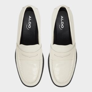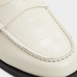 Warm cream croc-textured leather gives these penny loafers a subtle confidence. while a supple leather lining and slim rubber outsole make every step smooth from office meetings to evening socializing. Pair them with a navy suit for those key presentations or go casual with cuffed chinos at gallery visits-the croc embossing adds a touch of style naturally.