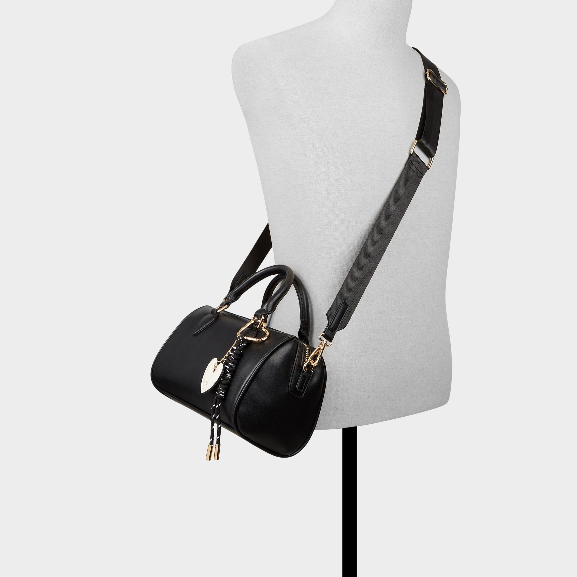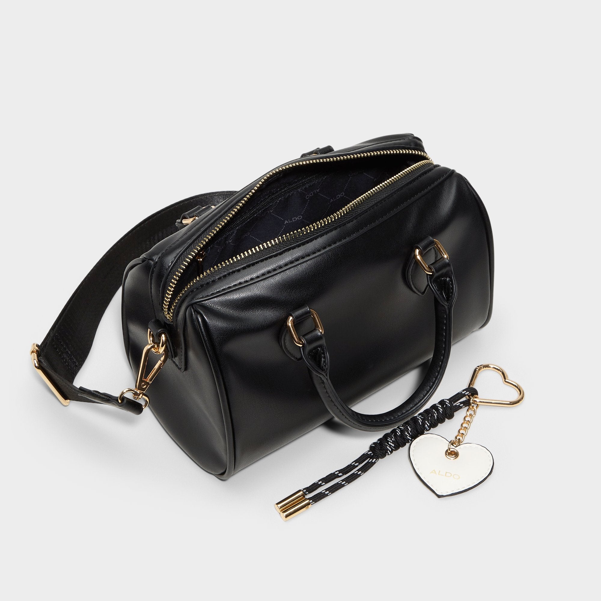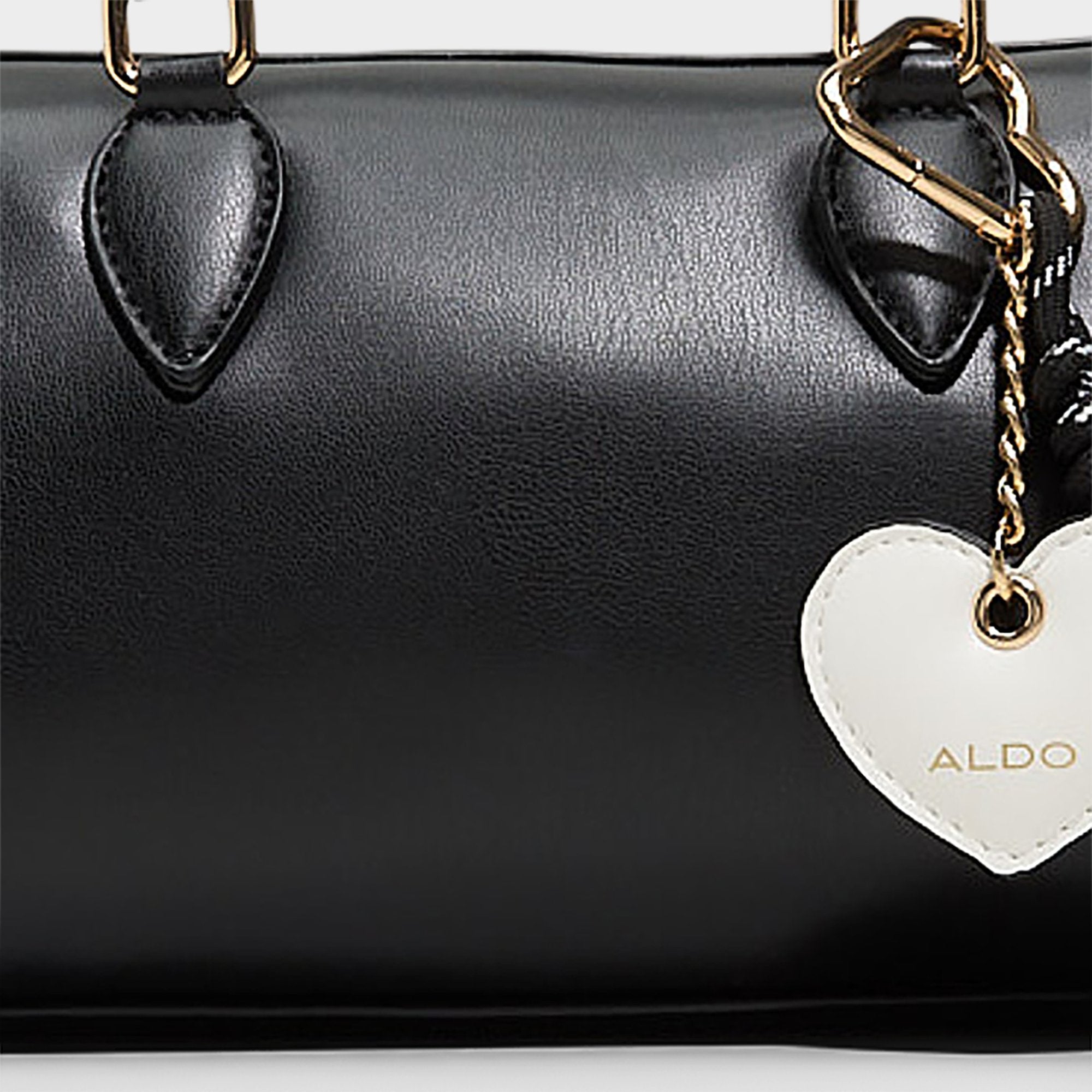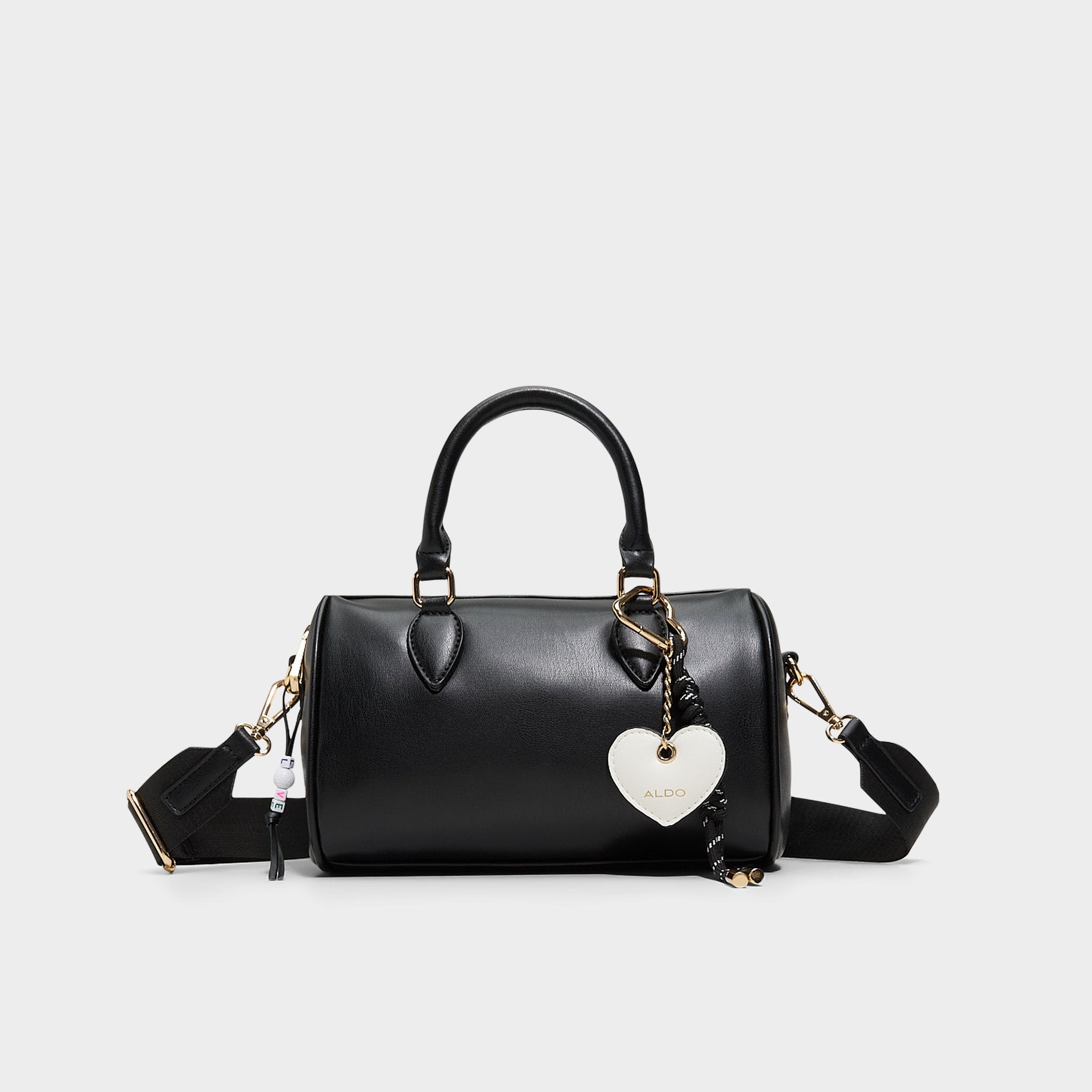 Black barrel bag with a convenient top handle and removable heart-shaped ornament. The perfect romantic accessory for Valentine’s Day plans—timeless style meets festive charm in one versatile piece.