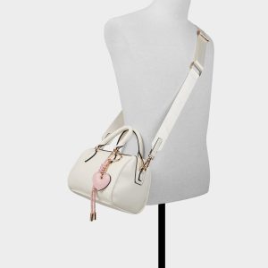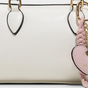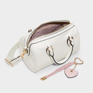 White barrel bag with a convenient top handle and removable heart-shaped ornament. The perfect romantic accessory for Valentine’s Day plans—timeless style meets festive charm in one versatile piece.