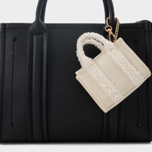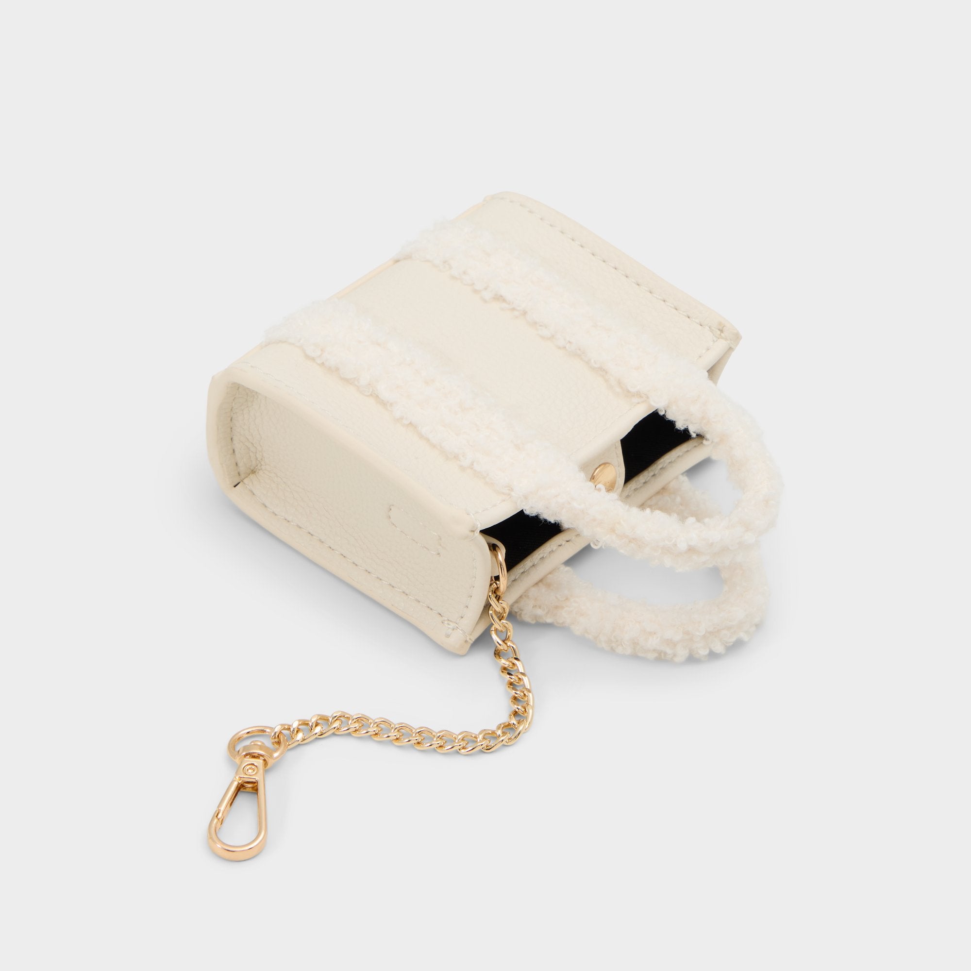 Plush faux-fur handles add a cuddle-soft contrast to this micro leather bag. with a gleaming chain that lets the creamy flap silhouette swing hands-free and light as air. just roomy enough for cards. gloss. and big plans. Pair it with a slouchy sweater and tall boots for coffee runs or sling it over a satin slip at rooftop parties.