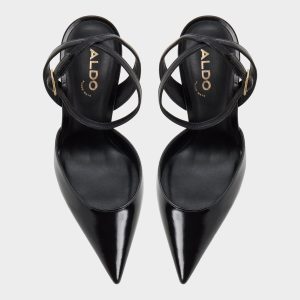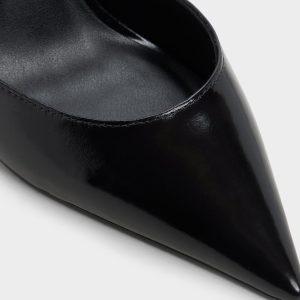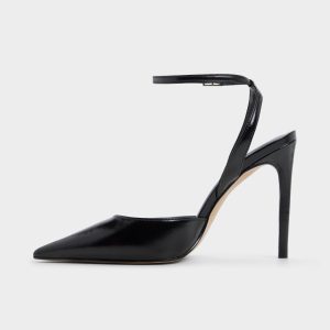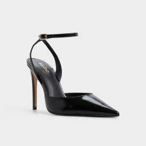 Sharper than a fresh idea. the glossy black leather pump frames every step with a sky-grazing stiletto heel. its delicate gold-buckle ankle strap locking in that after-dark confidence before you even speak. Team it with power suiting for pitch meetings or swap in a satin slip when candlelit dinners slide into rooftop dancing.