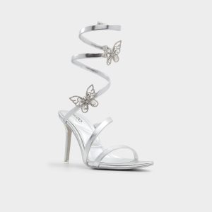 Delicate butterfly embellishments adorn these stunning strappy heeled sandals. Obsessed is an understatement.