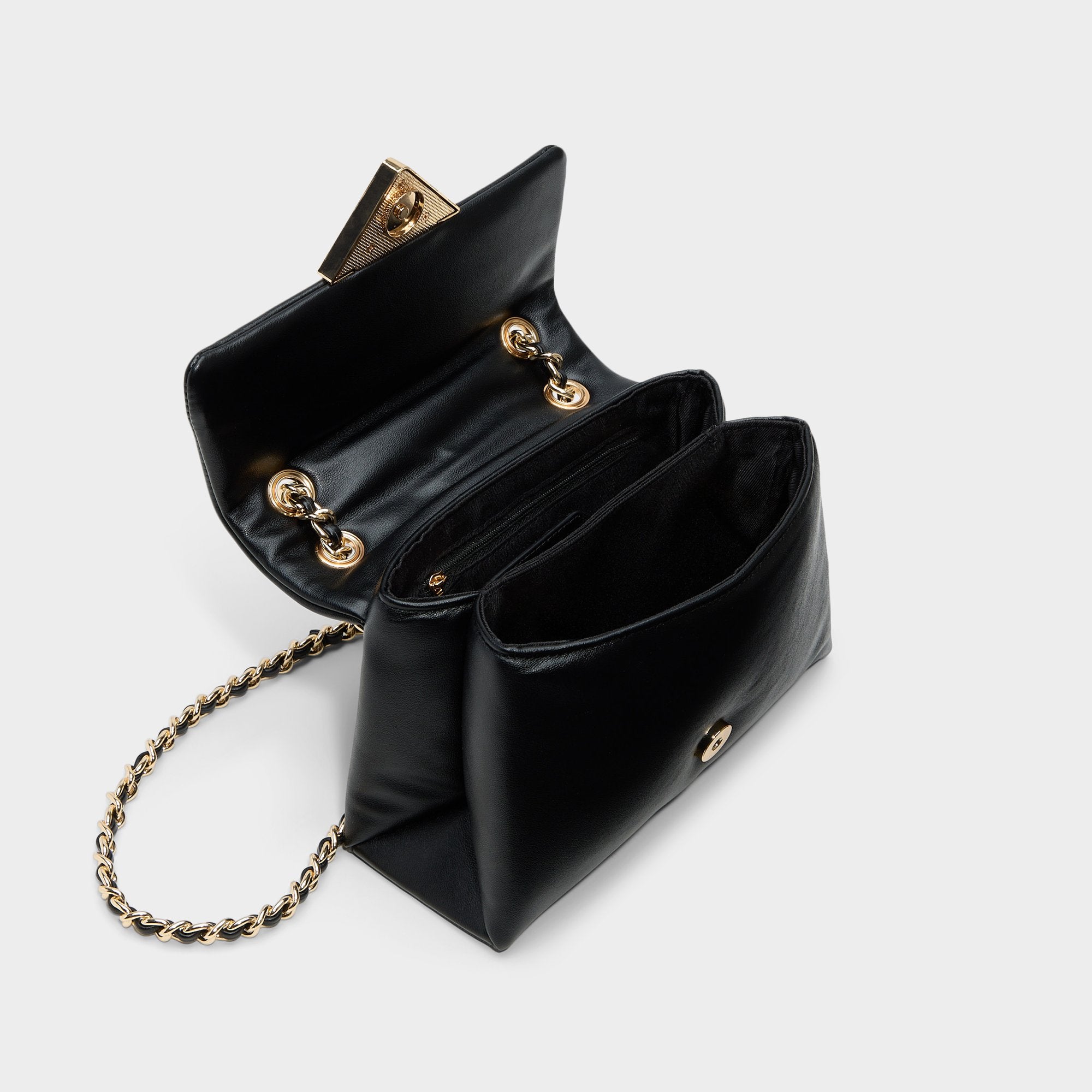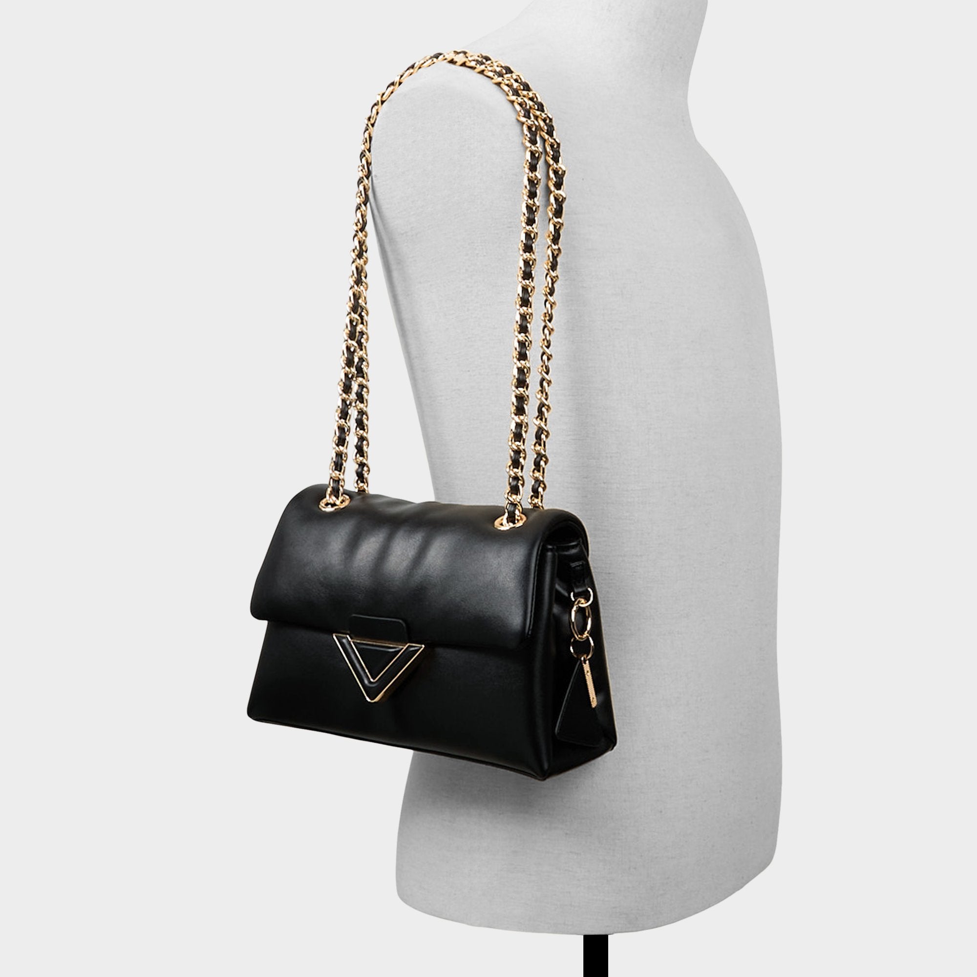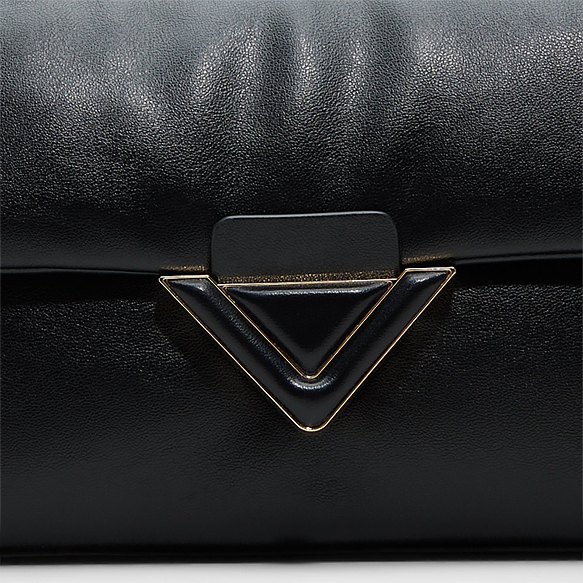 Pillow-soft black leather drapes a chain-draped crossbody. anchored by a sculpted triangle clasp that lends night-owl polish and plush confidence. turning everyday errands into a walk-on style stage for city nights and brunch runs. Hidden magnets snap shut for secure carry. while you sling it with a slip dress or tuck it beside a blazer.