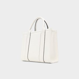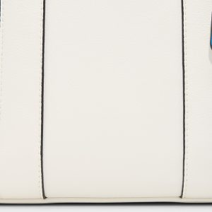 Clean-cut white leather with racer-black piping gives this mini tote modern edge. while a clip-off electric-blue paracord charm adds a playful pop to the open-top silhouette that’s made for quick grabs on the move. Carry it with an oversized linen blazer for coffee meetings or tuck next to denim cut-offs for festival days. finishing looks with crisp confidence.